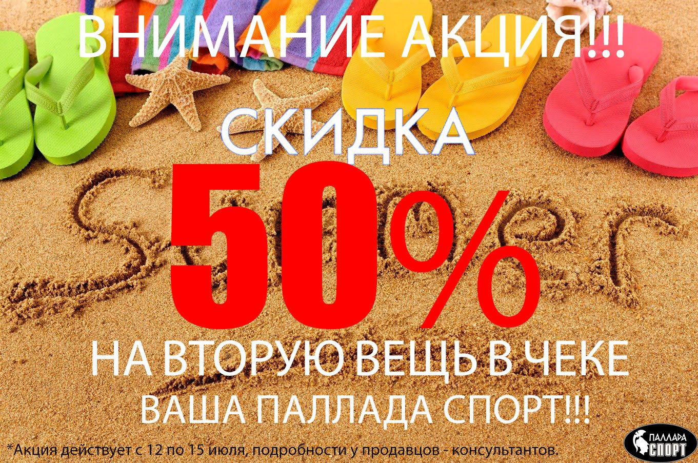 В магазине "Паллада спорт" с 12 по 15 июля 2016 года скидка 50% на вторую вещь в чеке!